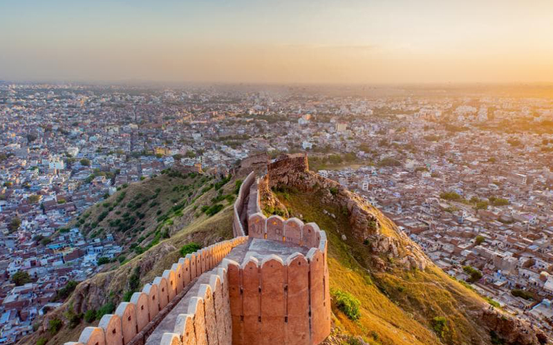 Once a defense fort, now a favorite sunset viewpoint offering panoramic views of Jaipur. Features historical structures and a stepwell.